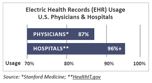 According to Stanford Medicine, 87% of U.S. physicians make use of EHRs in their practice, and HealthIT.gov reports that more than 96% of U.S. hospitals use EHRs.