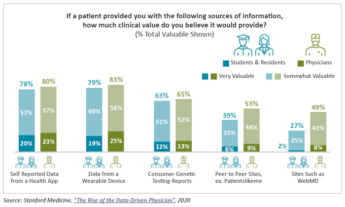 Not only are consumers using this data to inform their own daily decisions, they are also increasingly sharing it with their physicians and other healthcare providers. In the Stanford survey, 83% of physicians believed this data was at least somewhat valuable. And interestingly, 71% of physicians surveyed said they use the results or data from their own wearable devices to help inform their personal healthcare decisions.