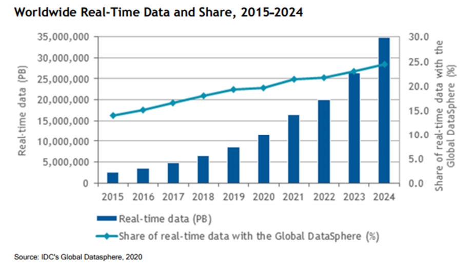 According to IDC, worldwide data is growing at a 26.0% CAGR, and in 2024 there will be 143 zettabytes of data. Real time data was less than 5% of all data in 2015, but will comprise almost 30% of all data by 2024. The analyst firm also projects that by 2021, 60-70% of the Global 2000 will have at least one mission-critical real-time workload.
