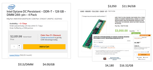 1. PMEM enables more memory. A key to putting the “Big” in Big Memory is the recent availability of high-density and affordable persistent memory (PMEM). PMEM 512GB DIMM modules offer 50% more capacity than the largest 256GB DRAM DIMMs, at one third to one fourth the cost per gigabyte.