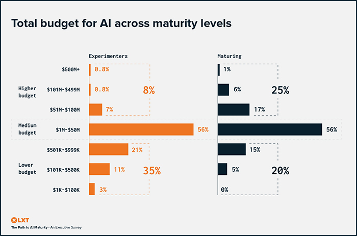 To get to maturity, a quarter of maturing organizations are spending $51 million or more on AI, compared to just 8% of experimenters who represent the 60% of companies that are in the earlier stages of maturity. This underscores the level of investment needed to get to AI maturity.