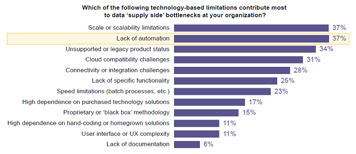 The findings are clear. As data workflows and processes have become more complex over time – and as organizational demand for data grows – there are clear points of friction in the data supply chain. Chief among them is that data suppliers who have limited resources, skills shortages and little automation are being tasked with delivering a steady stream of relevant data to a growing number of data consumers.