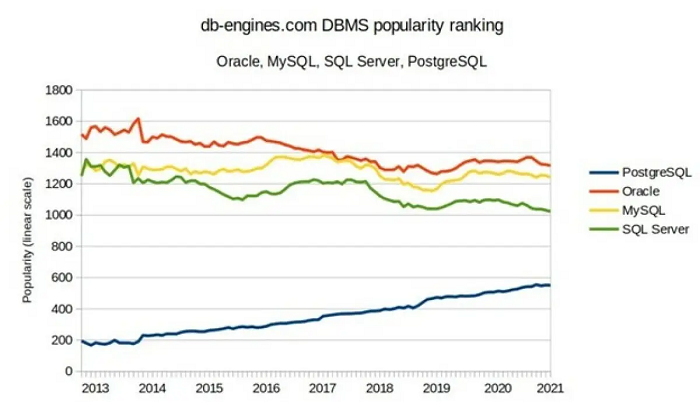 However, although Postgres still lags quite substantially behind the likes of MySQL and Oracle in total adoption, over the past several years, its year-over-year growth has been greater than any other relational database on the market — open source and proprietary. In fact, Postgres has nearly doubled in popularity over the past decade, rocketing up the charts at precisely the same time that many other leading DBMSs have seen their popularity decline.