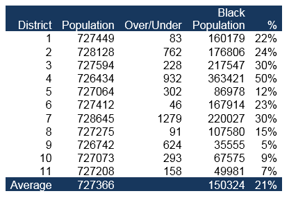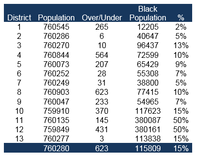 This optimization produced two such districts.  Figure 2 illustrates African American population percentage of the optimized thirteen districts.  In the final redistricting, seen in Figure 3, Districts11 and 12 are majority minority districts.  The population differential increased to 623, which is still a miniscule .082 percent variance.
