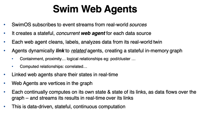 A link is like a sub in event streaming that allows concurrent, stateful Web Agents to share their in-memory states. Web Agents dynamically make, and break links based on changes in the real-world as they process events. The magic of linking is that it enables a Web Agent to compute, concurrently and in real time using both its own state and the state of other agents to which it is linked, enabling granular contextual analysis, learning and prediction, and an active response. So, the knock-on effects of changes on the part of an entity in the real-world are immediately visible as state changes in its Web Agent – to all related (linked) Web Agents in the digital application domain. Each Web Agent continuously computes on its own state and the states of all other Web Agents to which it is linked. Computation can occur when an event arrives, at a per-agent scheduled time, according to triggers or windows, or a change in state of a linked Web Agent. Furthermore, Swim attaches sophisticated relational logic to links: They can perform complex database-specific computations, concurrently and in real time including maps, joins, reductions, aggregations and more.