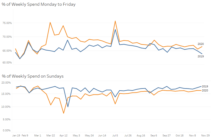 Figure 1 depicts how grocery shopping patterns changed due to the COVID-19 pandemic and stayed for the long term as the pandemic continued and remote work became the norm for high income knowledge workers. The chart compares the behavior of grocery shoppers on Sundays versus weekdays in 2019 and 2020, and there is a distinct shift from Sunday shopping to weekday shopping (Saturdays remained flat and are not shown).