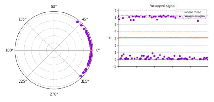 Conventional methods suitable for the analysis of linear data don’t fit angular data. First, let’s consider a zero-mean – normally distributed angular signal with standard deviation (std) of 0.3 radian. At first glance, when examining this distribution over the real plane (Fig 1.a), it appears to come from two populations being wrapped between 0 to 2π rad. Calculating the familiar linear arithmetic mean will return π as a result, but, after the signal is represented as points on the circumference of a unit circle (Fig 1.b), it is clear that the mean is actually 0 rad.