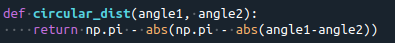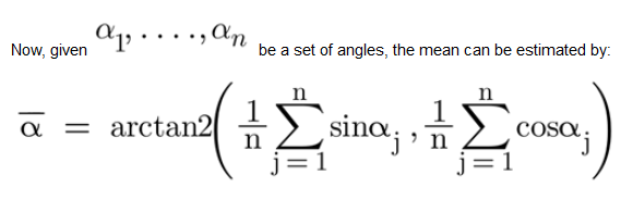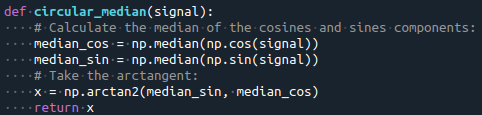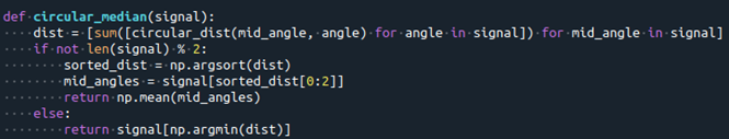 In statistics, a median is a value separating the higher half from the lower half of a data sample. It can be handy when treating non-Normal distributions because it is less affected by a small proportion of extremely large or small values. The median of a data sample can be defined as the observation with the minimum distance to all the other observation in the sample. What’s left is to combine the definition of the median with the definition of circular distance:
