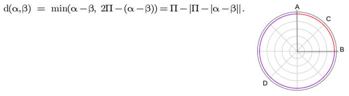 represent the angles corresponding to the points A, B over the unit circle. The red arc is shorter than the purple, hence, we define the circular distance to be the arclength ACB. The circular distance always lies in [0,π) since there are no two points on the circumference of a circle that can be farther than π.