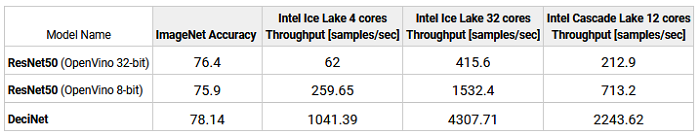 For their CV submission, Deci submitted three of its DeciNets models in the ResNet50 category under the offline scenario in the open division. Deci made submissions on two different hardware platforms: a 12-core Intel Cascade Lake CPU and two different Intel Ice Lake CPUs with 4 and 32-cores. Models were optimized on a batch size of 32 and quantized to INT8 using OpenVINO. Compared to the 8-bit ResNet50 model, Deci delivered +1.74% improvement in accuracy and 4x improvement in throughput.
