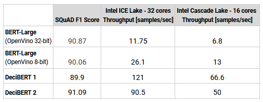 For NLP, Deci submitted its optimized DeciBERT models that produced outstanding results: accelerating question-answering tasks’ throughput performance on various Intel CPUs by 5x (depending on the hardware type and quantization level) while also improving the accuracy by +1.03%.