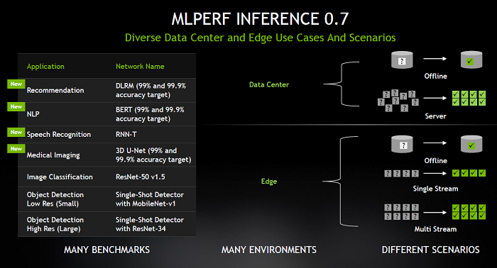 NVIDIA and its partners submitted their MLPerf 0.7 results using NVIDIA’s acceleration platform, which includes NVIDIA data center GPUs, edge AI accelerators and NVIDIA optimized software.