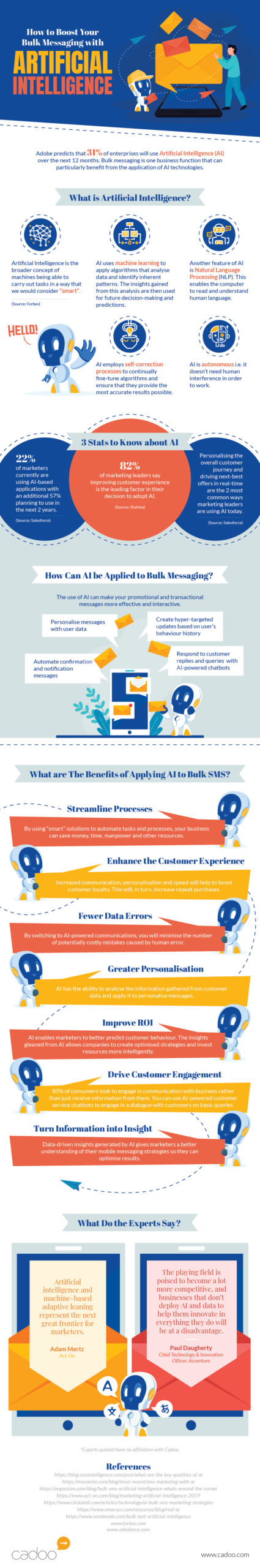 Adobe predicts that 31% of enterprises will use Artificial Intelligence (AI) over the next 12 months. Bulk messaging is one business function that can particularly benefit from the application of AI technologies. In this infographic from our friends over at Cadoo, we will explore how marketers can apply AI to their mobile messaging campaigns to optimze success.