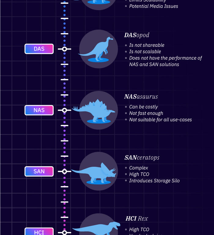 Our friends over at Hedvig produced the compelling “Jurassic” themed infographic below on the evolution of storage and the demise of prehistoric storage solutions. The graphic exposes the data explosion that has taken place in the last decade, and why this has caused the near extinction of outdated storage solutions in terms of the many challenges these prehistoric solutions presented.