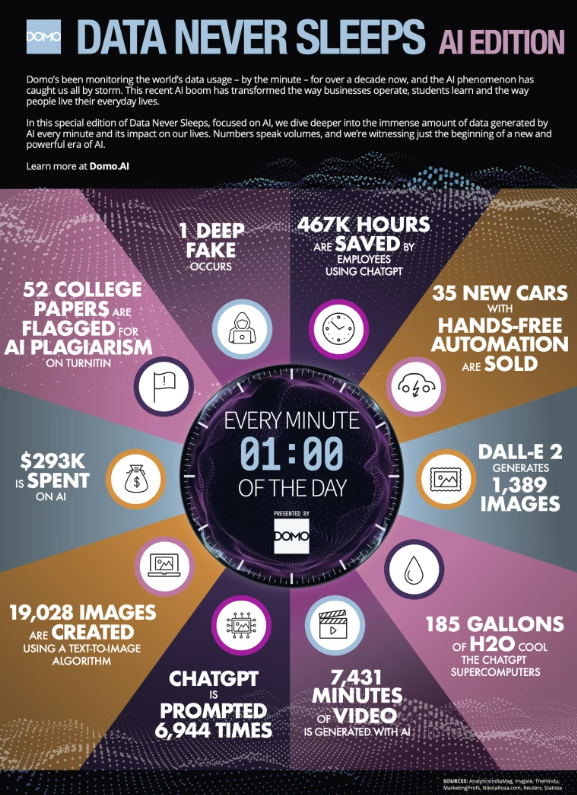 Our friends over at Domo (Nasdaq: DOMO) unveiled a special edition of its popular Data Never Sleeps (DNS) infographic, focused on the proliferation of artificial intelligence (AI). An extension of Domo’s award-winning annual DNS report, this AI Edition provides a deeper dive into the immense amount of AI data generated every minute and the impact this brings into our everyday lives.