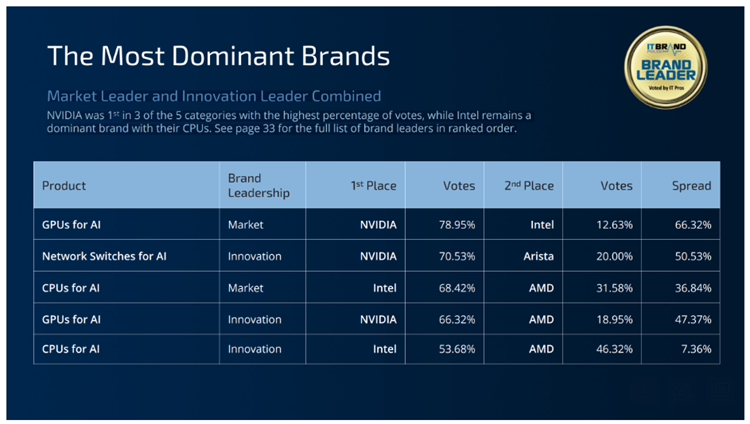 NVIDIA was first place in three of the five brand leadership categories with the highest percentage of votes, while Intel remains dominant with their CPUs. See page 32 in the report for the full list of brand leaders in ranked order.