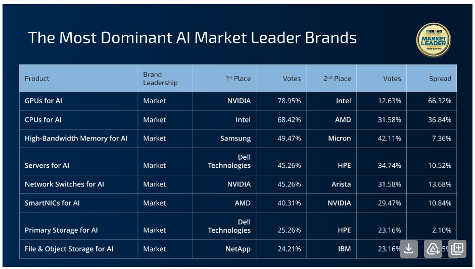 The most dominant Market Leader brand in AI is NVIDIA for GPUs. The company received almost 80% of IT pros votes with second place Intel receiving a surprisingly high 12% of the votes. Intel and Samsung, brands long dominant in the CPU and DRAM markets, are the second and third strongest Market Leader brands in Enterprise Infrastructure for AI.