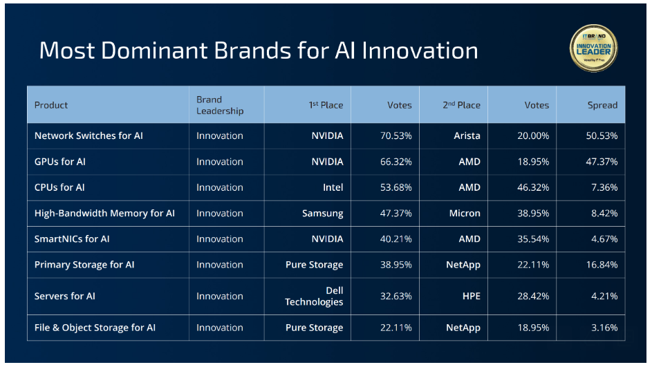 “At this inflection point, AI versions of products have emerged and traditional brand leaders are being challenged,” said Frankie Berry, Managing Partner and Senior Analyst at IT Brand Pulse. “The survey results indicate NVIDIA has jumped to the front of the pack as the most dominant brand, while the strong have gotten stronger as IT pros voted for familiar brands in all eight categories of Enterprise Infrastructure for AI.”